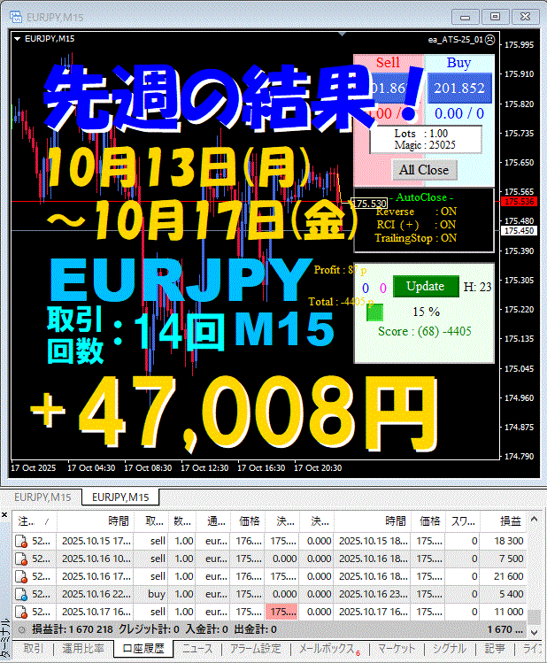 M15 週間報告!【EURJPY】ATS-25 ☆10月13日(月)~10月17日(金)