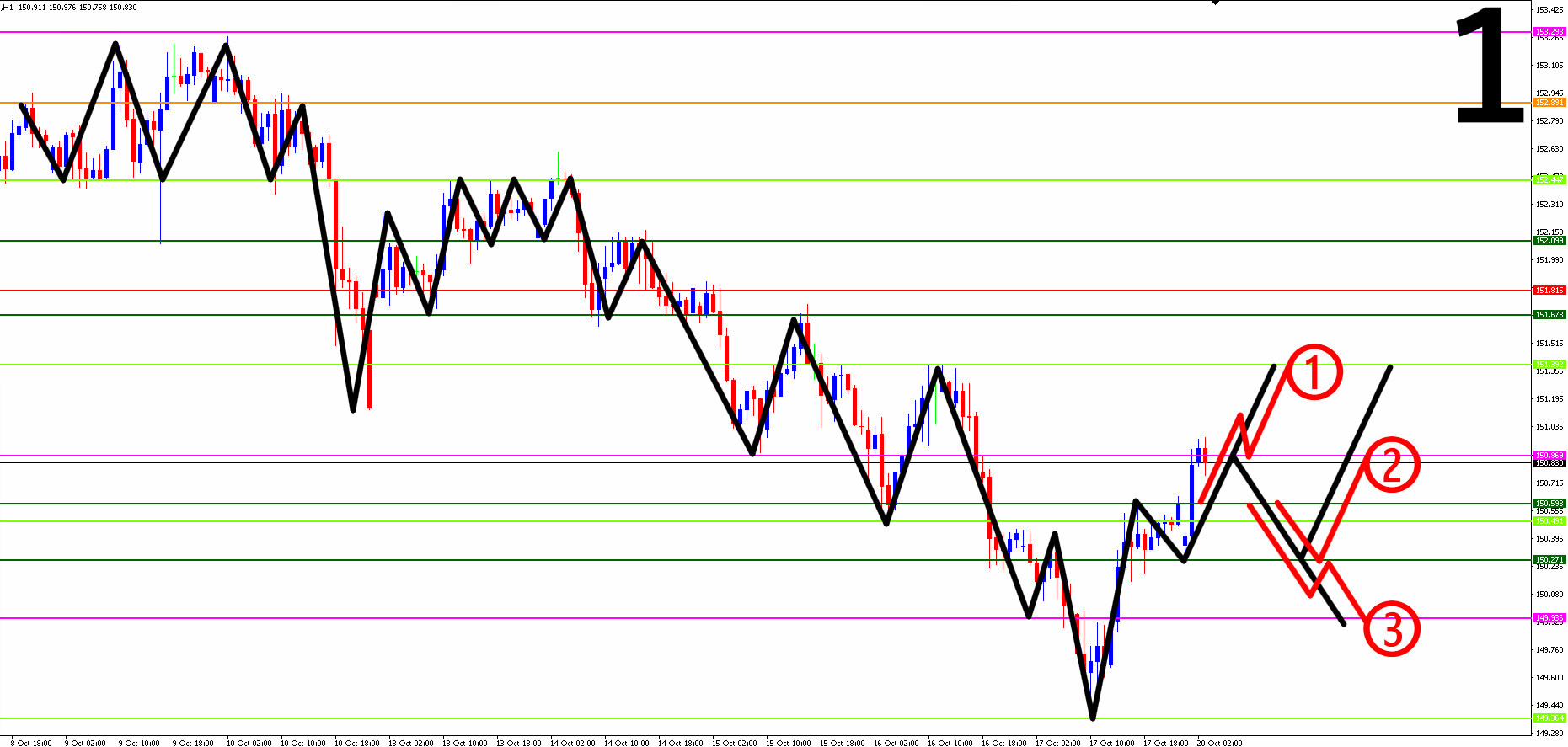 ●1時間足:買い優勢 そのまま上昇していくのか。直近安値まで下降していくのか。という相場状況