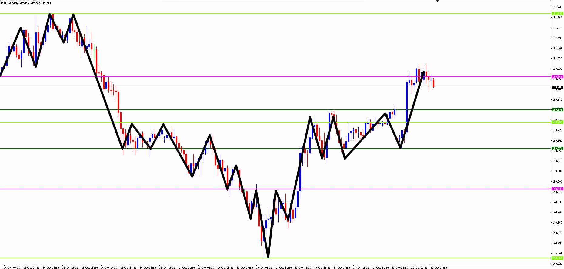 ●日足・4時間足・1時間足・15分足までの相場を水平線と波動(ダウ理論)を使って環境認識し、勝率の高いエントリーポイントを3つに絞る