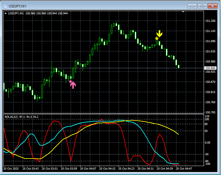 【RCIを極めて勝つ!!】ドル円 1分足 mBDSRの押し目買いサインと戻り売りサイン