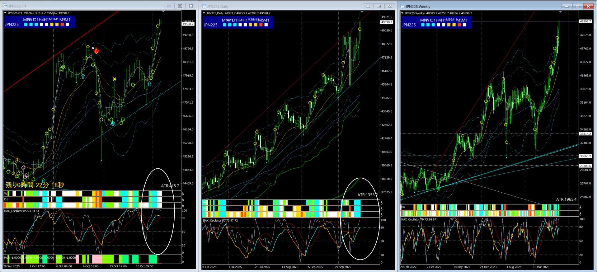 一方で、週足のMAXオシレーター、シンクロバンドは「強い上昇」を示唆