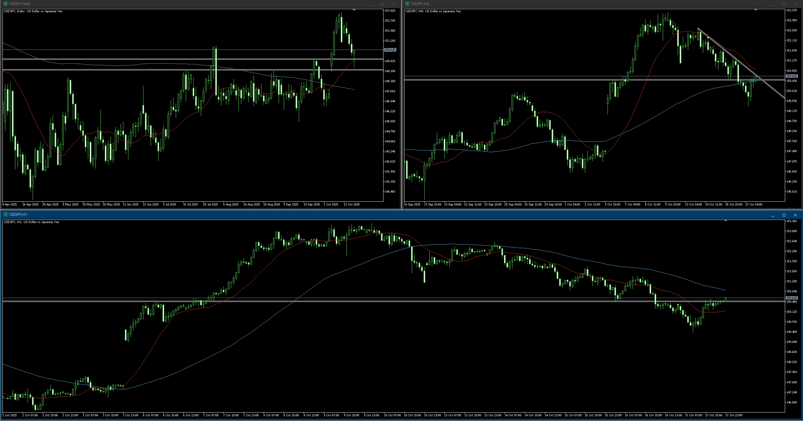 環境認識で4hをシンプルに見ている流れについてご紹介します。まずは4hで並べたチャートを見ます。何に注目しているかというと、