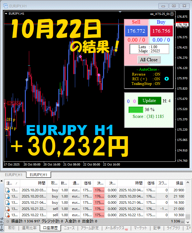 【前日の結果】EURJPY H1 / M5 『ATS-25』10月22日