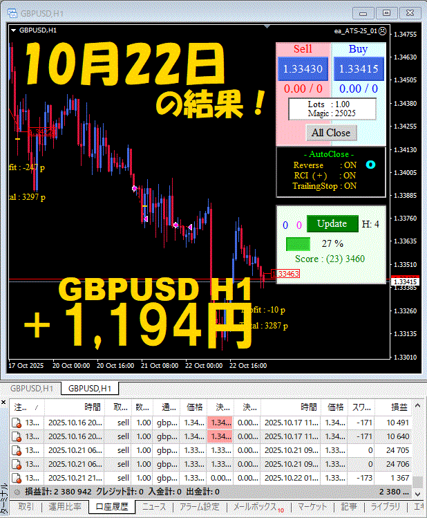 【前日の結果】GBPJPY H1 / M5 『ATS-25』10月22日