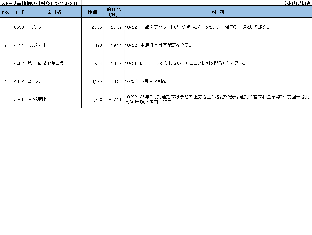 カブ知恵発 ストップ高銘柄の材料(2025/10/23)