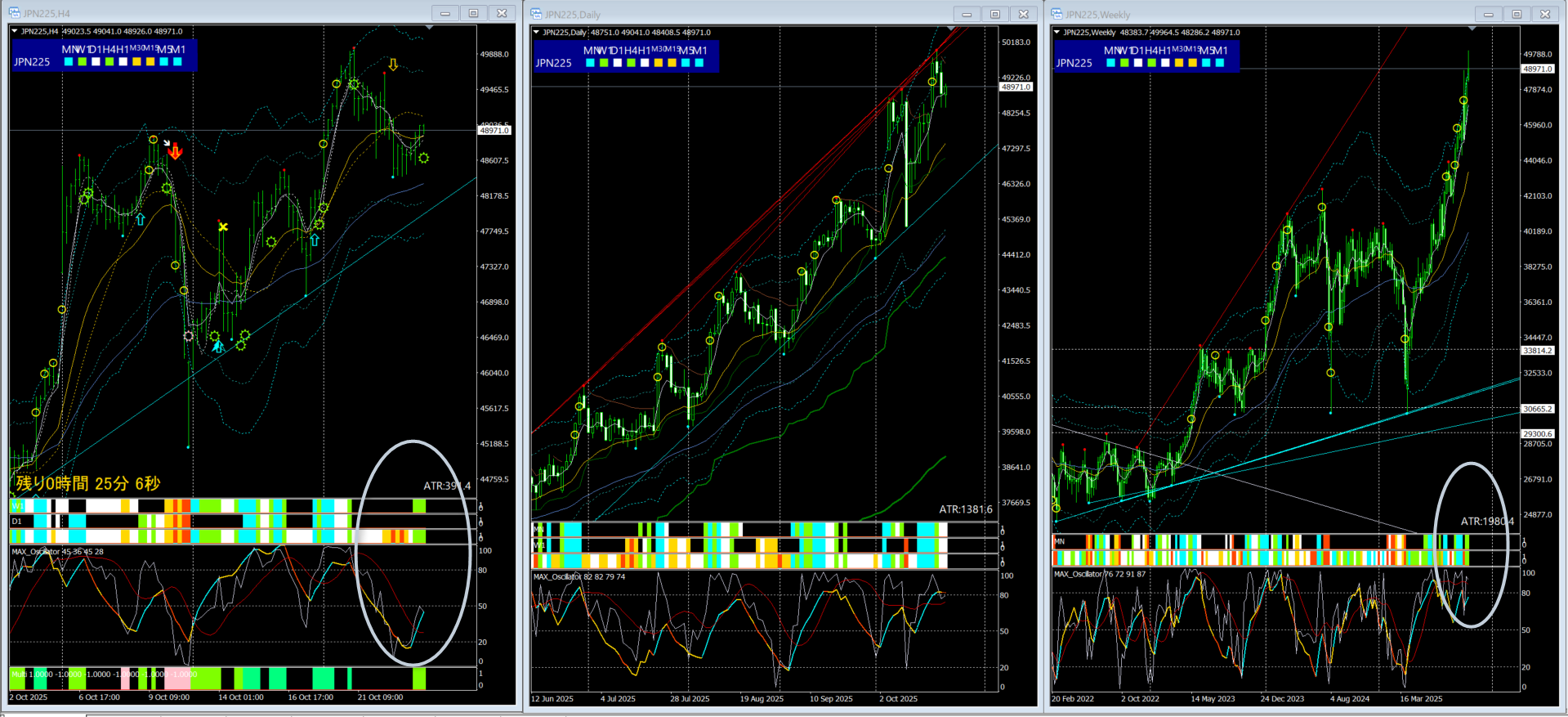 一方で、週足のMAXオシレーター、シンクロバンドは「弱い上昇」を示唆