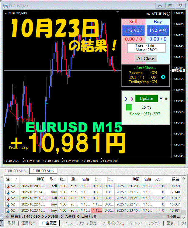【EURUSD M15】前日の結果『ATS-25』 10月23日