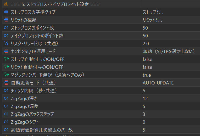 | ストップロスの基準タイプ | ZIGZAG |