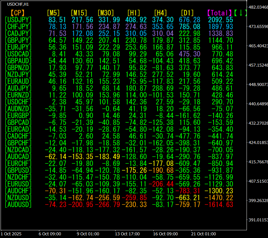 [Total]数値の降順に並んでいます。一番上にあるUSDJPYは、全ての時間足で青色系の表示色になっています。Total数値が2092.55がと、プラスの数字になっています。USDJPYに上昇トレンドが発生していることが示されます。