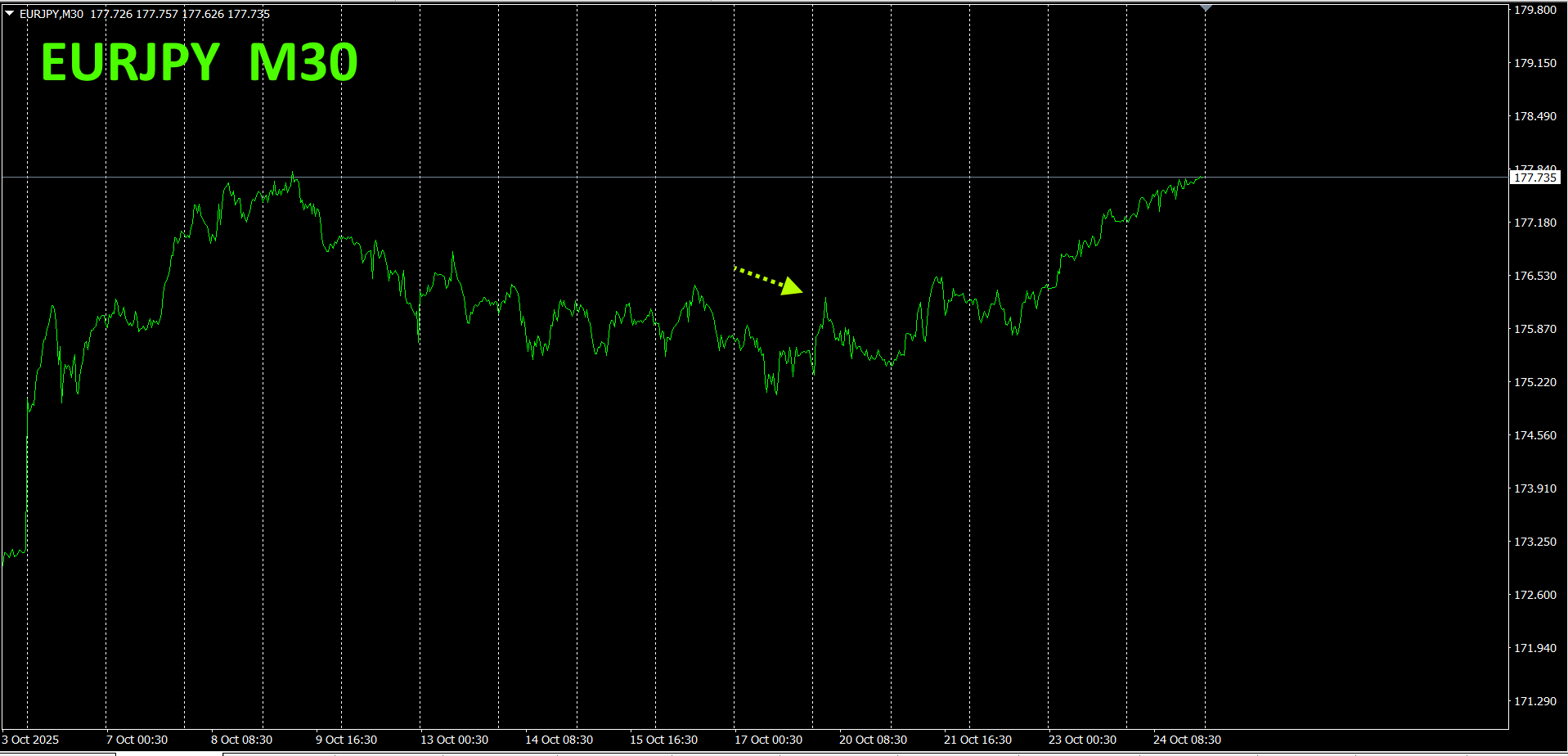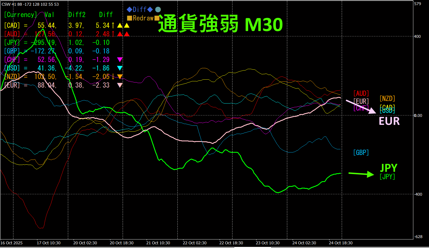 ピンク色がEUR、緑色がJPYです。通貨強弱チャートでは、JPY>EURであり、今後の方向として、JPYもEURも下向きですが、EURの角度がやや急なので、EURJPYは、今後も下降気味に推移するものと考えられます。