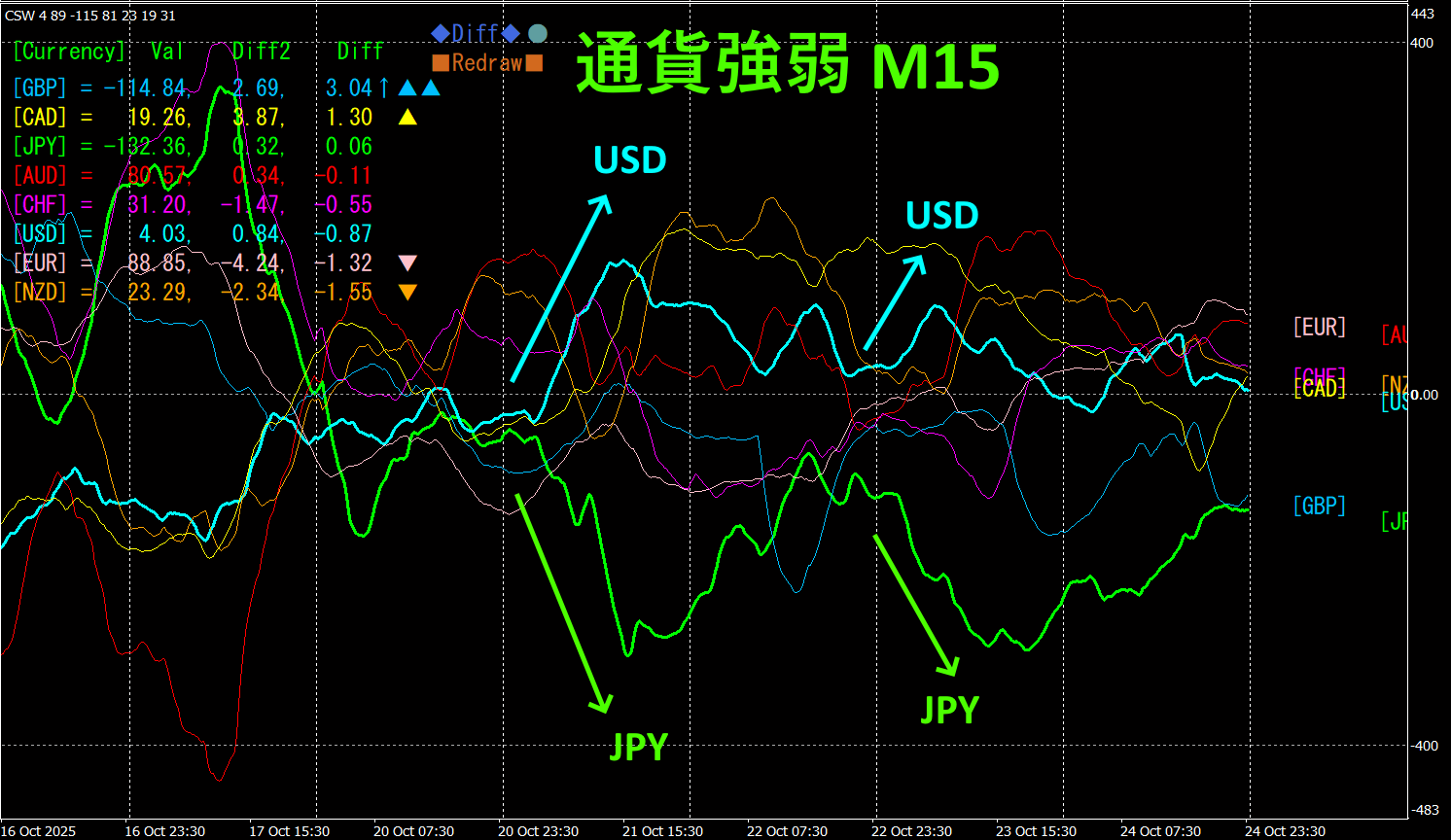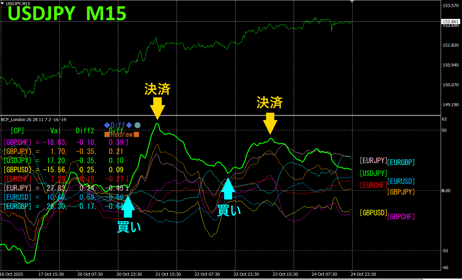 上半分は、USDJPYの15分足チャートです。下半分は、「8CP見える化インジケータ」によるものです、緑色太線のグラフがUSDJPYに相当します