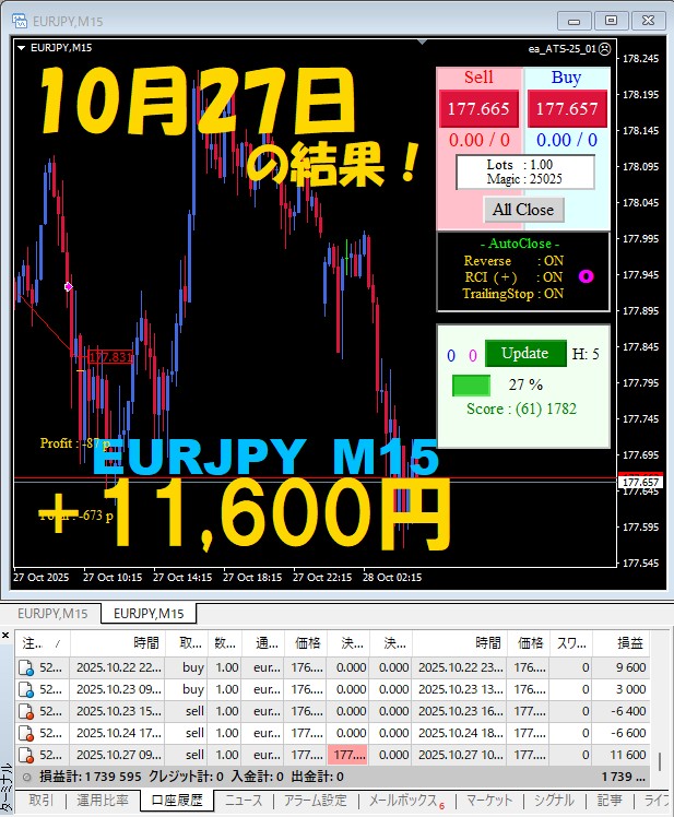 【EURJPY M15】前日の結果『ATS-25』 10月27日
