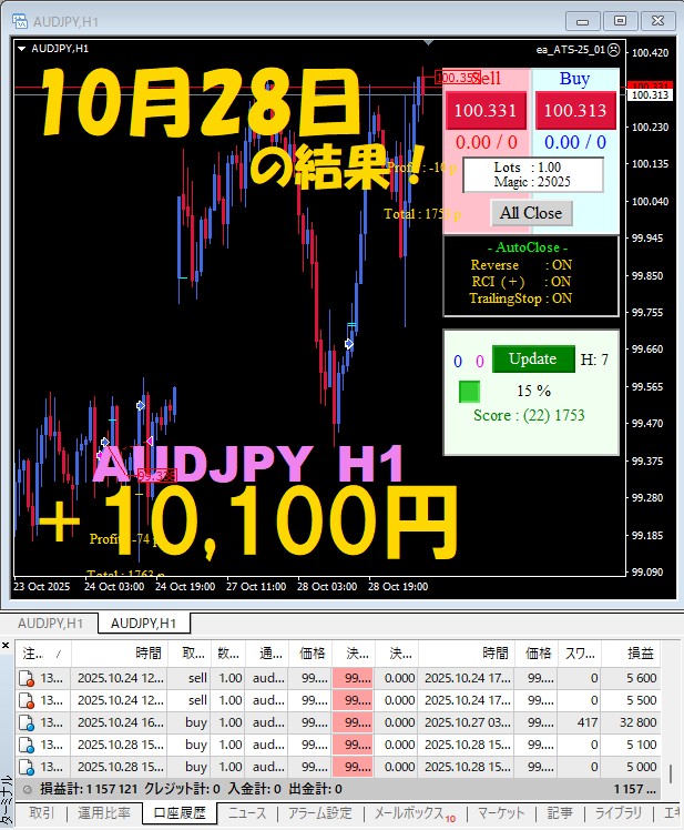 【前日の結果】AUDJPY H1 / M5 『ATS-25』10月28日