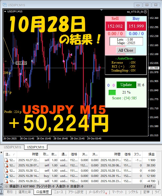 【USDJPY M15】前日の結果『ATS-25』 10月28日