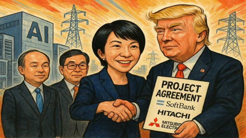 çµæžåéã§ã¯ãåŸåããã®å¯Ÿç±³æè³ããã±ãŒãžïŒç·é¡çŽ80å åèŠæš¡ïŒã«é¢ããçŽ60å ååã§å ·äœåã®ã¡ããç«ã£ããšã®æŽçã瀺ãããŸãããåéã¯ãAIããŒã¿ã»ã³ã¿ãŒçšã®é»æºã»éé é»ç¶²æŽåãAIã€ã³ãã©ãã®ãã®ãåååã®åè©äŸ¡ãšé¢é£ãµãã©ã€ãã§ãŒã³ãLNGãªã©ã®ãšãã«ã®ãŒãã¬ã¢ã¢ãŒã¹ãããã±ã«çã®éèŠé±ç©ããããŠè£œé æ ç¹ã®é«åºŠåãŸã§å¹ åºããæ¥æ¬äŒæ¥ïŒãœãããã³ã¯ã°ã«ãŒããæ¥ç«ãäžè±é»æ©ãæ±èãªã©ïŒã®é¢äžãç®ç«ã¡ãŸãã