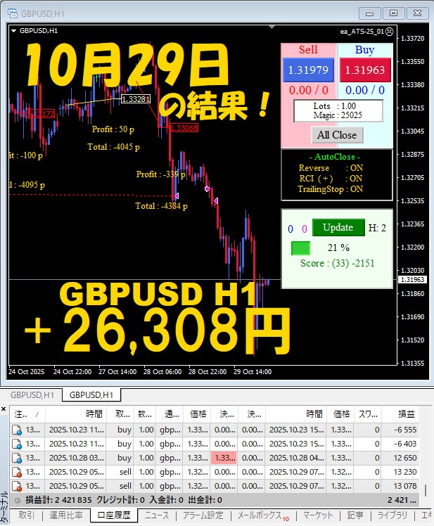 【前日の結果】GBPJPY H1 / M5 『ATS-25』10月29日