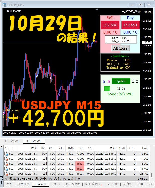 【USDJPY M15】前日の結果『ATS-25』 10月29日