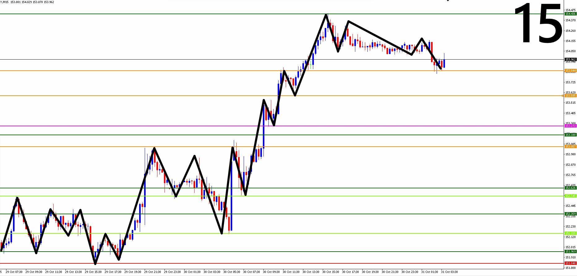 ●日足・4時間足・1時間足・15分足までの相場を水平線と波動(ダウ理論)を使って環境認識し、勝率の高いエントリーポイントを3つに絞る
