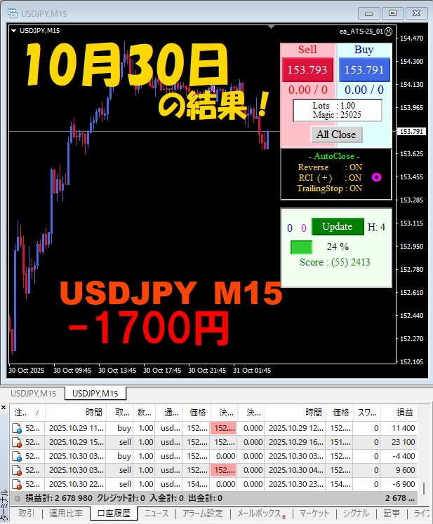 【USDJPY M15】前日の結果『ATS-25』 10月30日