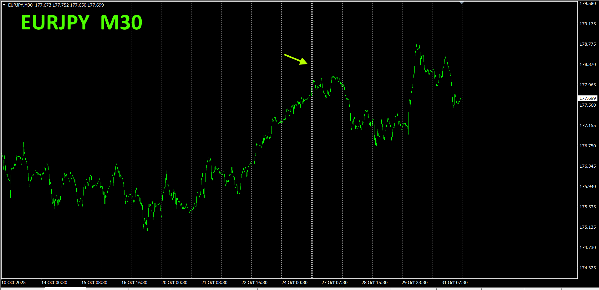 全体の流れを見るため、30分足チャートで直近約3週間分を描いています。