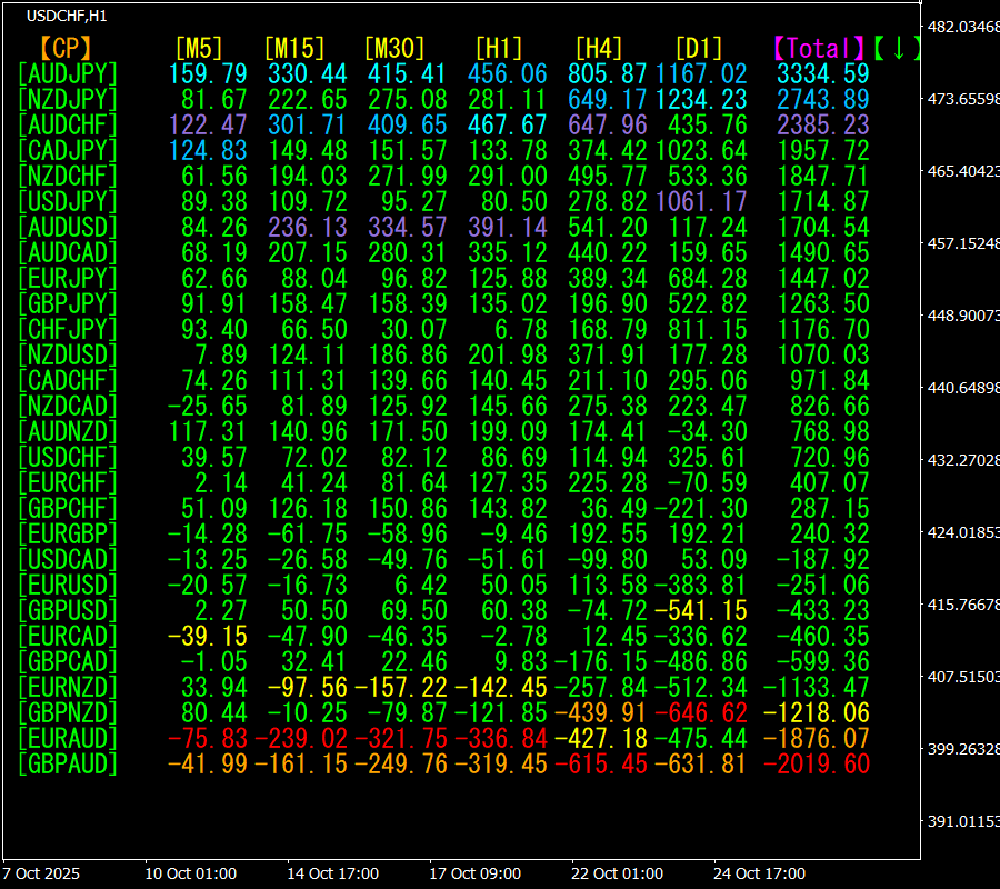 [Total]数値の降順に並んでいます。一番上にあるAUDJPYは、全ての時間足で青色系の表示色になっています。Total数値が3334.59と、プラスの数字になっています。AUDJPYに上昇トレンドが発生していることが示されます。