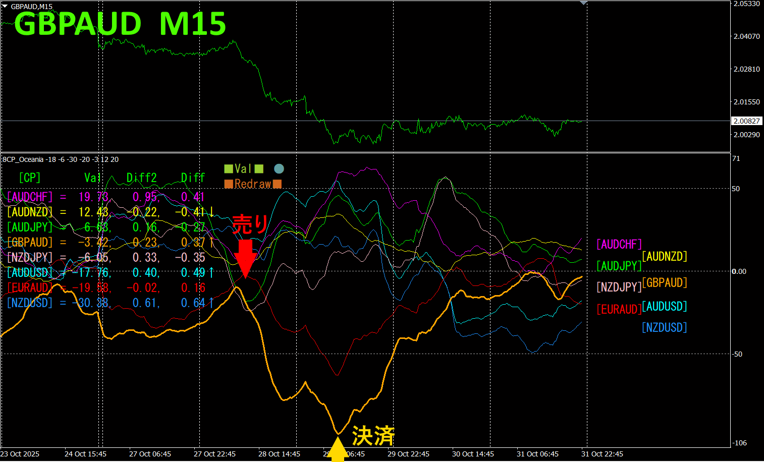 上半分は、GBPAUDの15分足チャートです。下半分は、「8CP見える化インジケータ」によるものです、橙色太線のグラフがGBPAUDに相当します