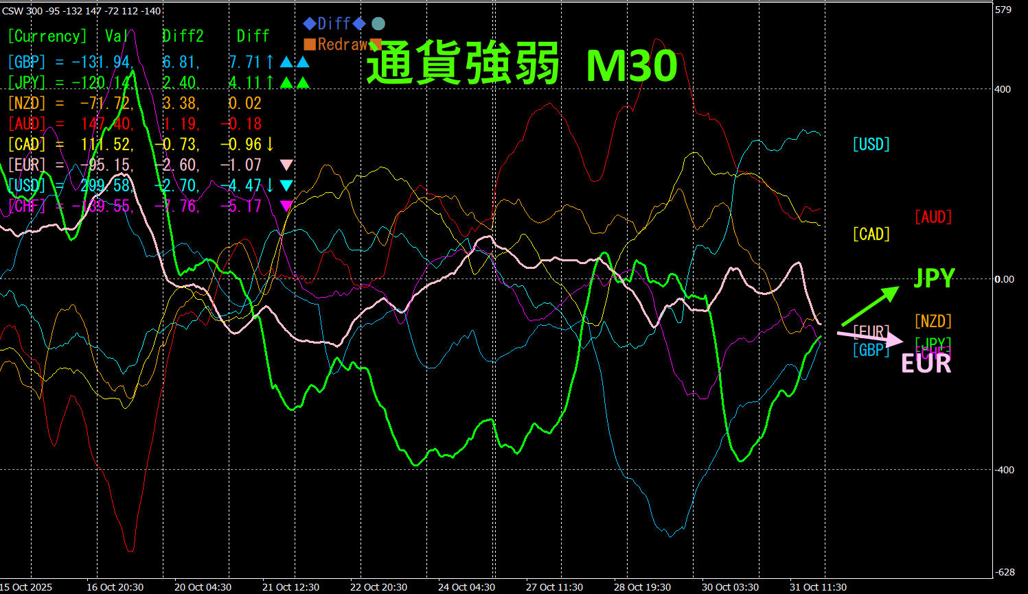 ピンク色がEUR、緑色がJPYです。通貨強弱チャートでは、EURはやや下向き、JPYは上向きになっているので、今後の方向として、EURJPYは下降気味に推移するものと考えられます。