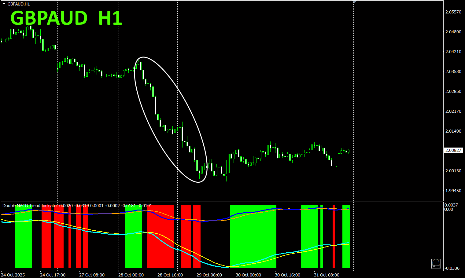 売りゾーンの赤色と、買いゾーンの緑色が、綺麗に分かれていて、一目でトレードがしやすくなります。全体的に下降トレンドになっているので、上の図の白丸で囲んだ部分だけで、売りトレードをすれば良いです。インジケータのカラーに従い、赤色なら売りです。これで、トレンドが伸びる部分だけに絞って、無理なく利益を得ることができます。