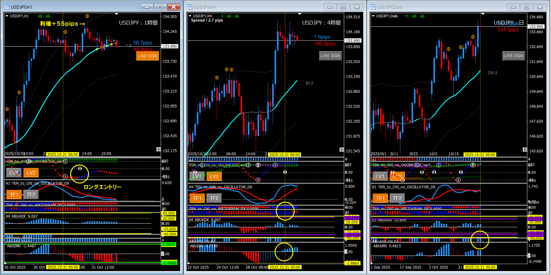今回は日足のABUADX_DXなどを根拠に目線を上と判断し、1時間足でロングエントリーポイントを探します。1時間足のオシレーターが押し目買いのパターンなのでラインタッチせずともオシレーターTF1の動向をトリガーにしても全然問題ありません。
