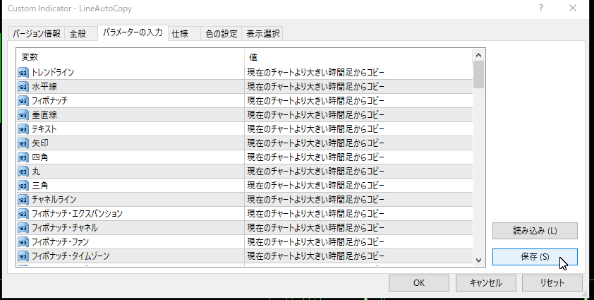 インジケーターの設定は、ファイルとして保存・読み込みすることができます。