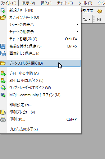 - MT4メニューの「ファイル」→「データフォルダを開く」をクリックします。