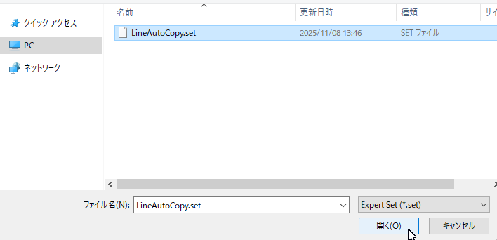 MQL4/Presetsフォルダにコピーしてから「読み込み」を行ってください。 - ファイル名を変更しても問題ありませんが、拡張子