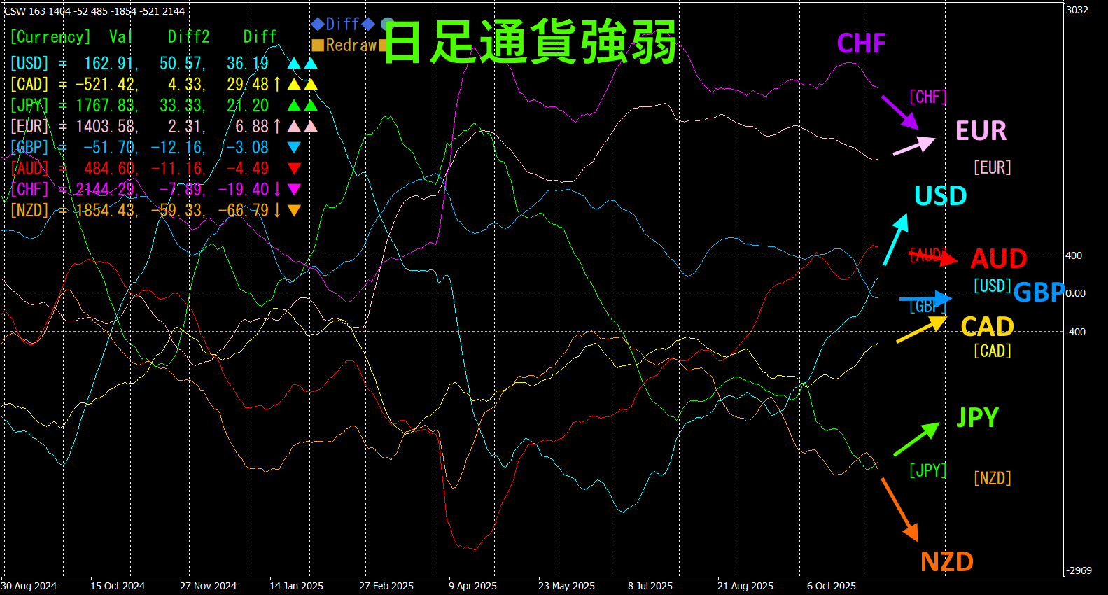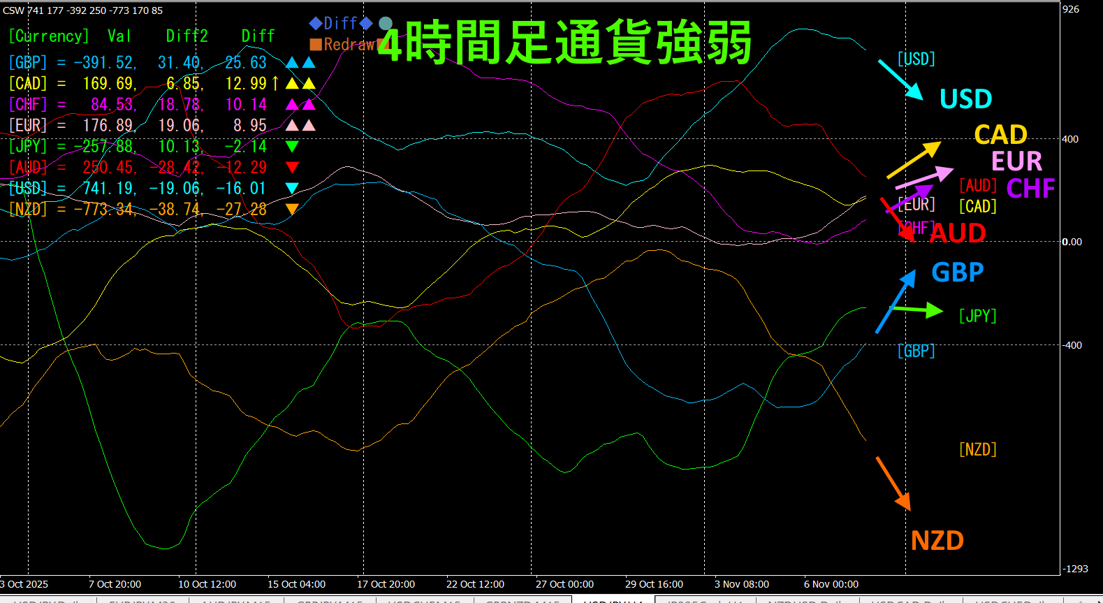 4時間足では、GBP、CAD、CHF、EURが上向きに、NZD、USD、AUD、JPYが下向きになっています。