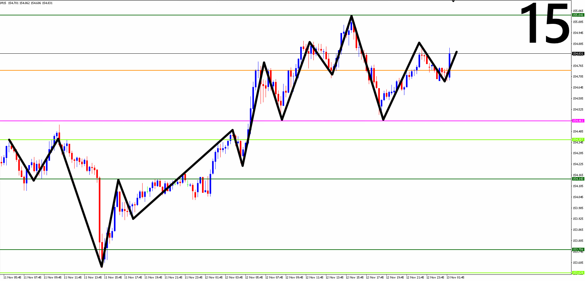 ●日足・4時間足・1時間足・15分足までの相場を水平線と波動(ダウ理論)を使って環境認識し、勝率の高いエントリーポイントを3つに絞る