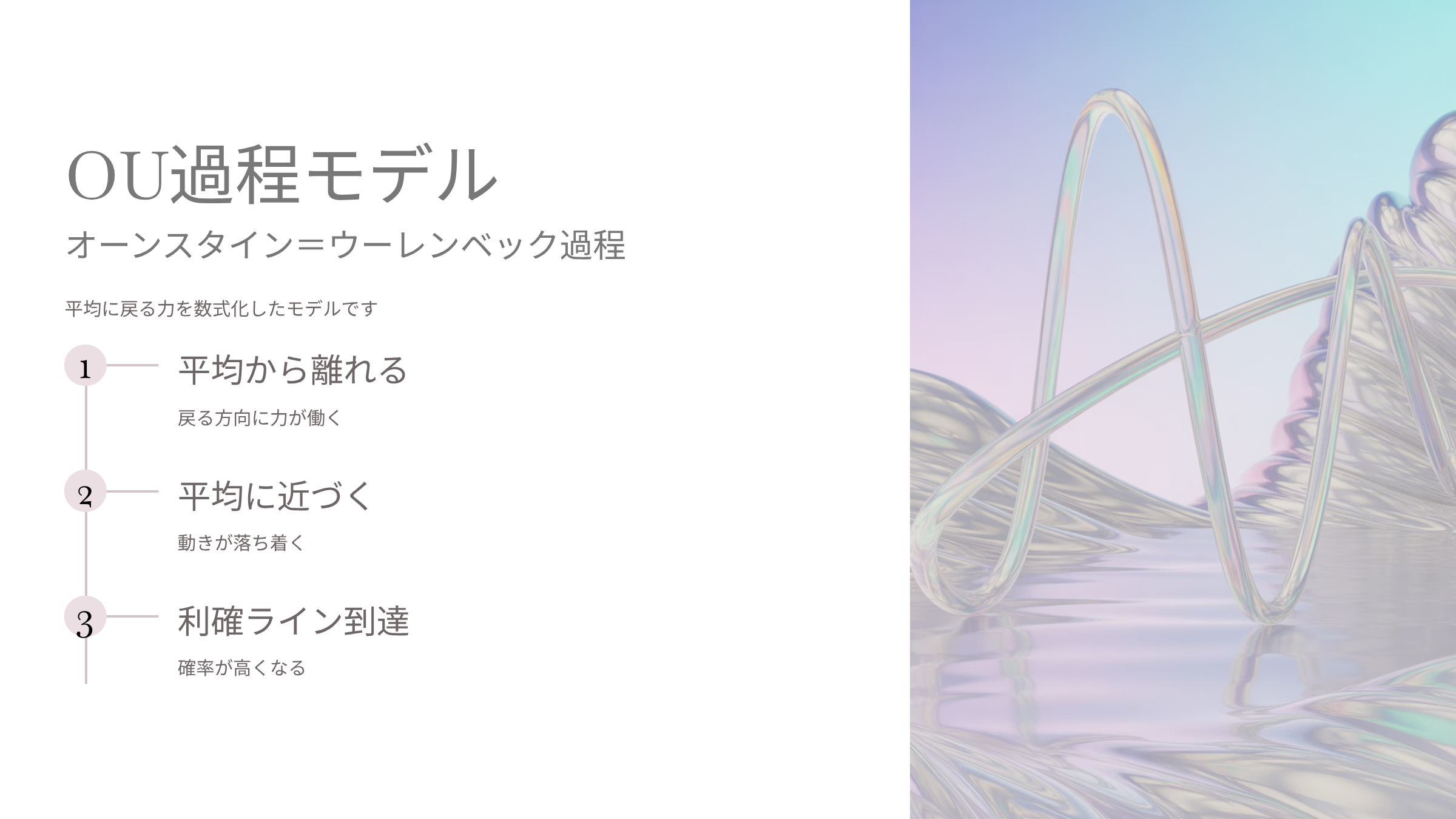 平均に戻る力を数式化した OU(オーンスタイン=ウーレンベック)過程では、