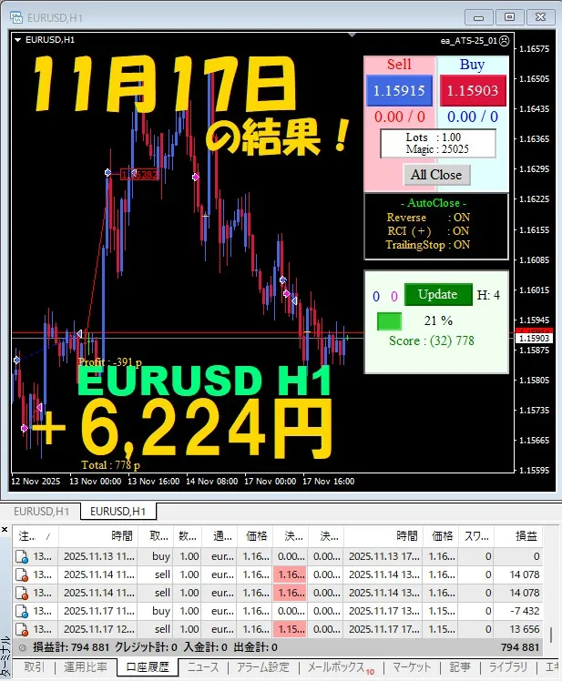 【前日の結果】EURUSD H1 / M5 『ATS-25』11月17日