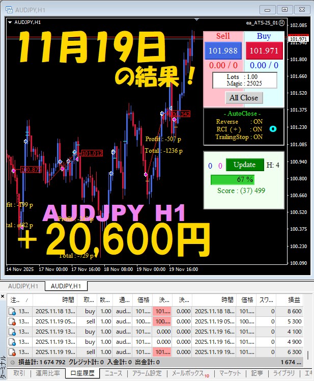 【前日の結果】AUDJPY H1 / M5 『ATS-25』11月19日