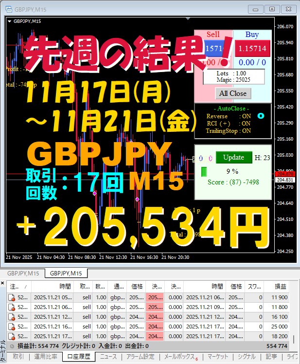 M15 週間報告!【GBPJPY】ATS-25 ☆11月10日(月)~11月14日(金)