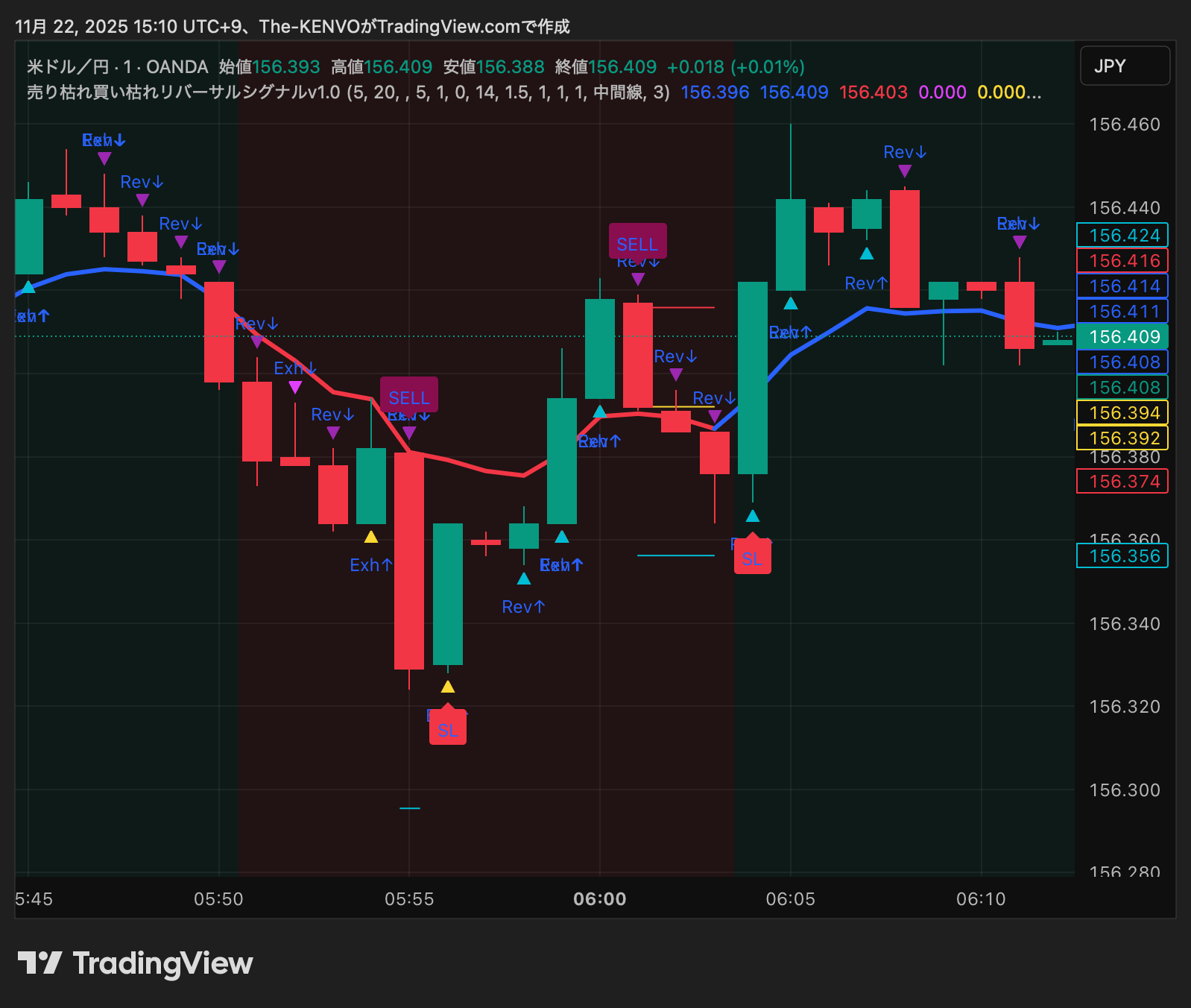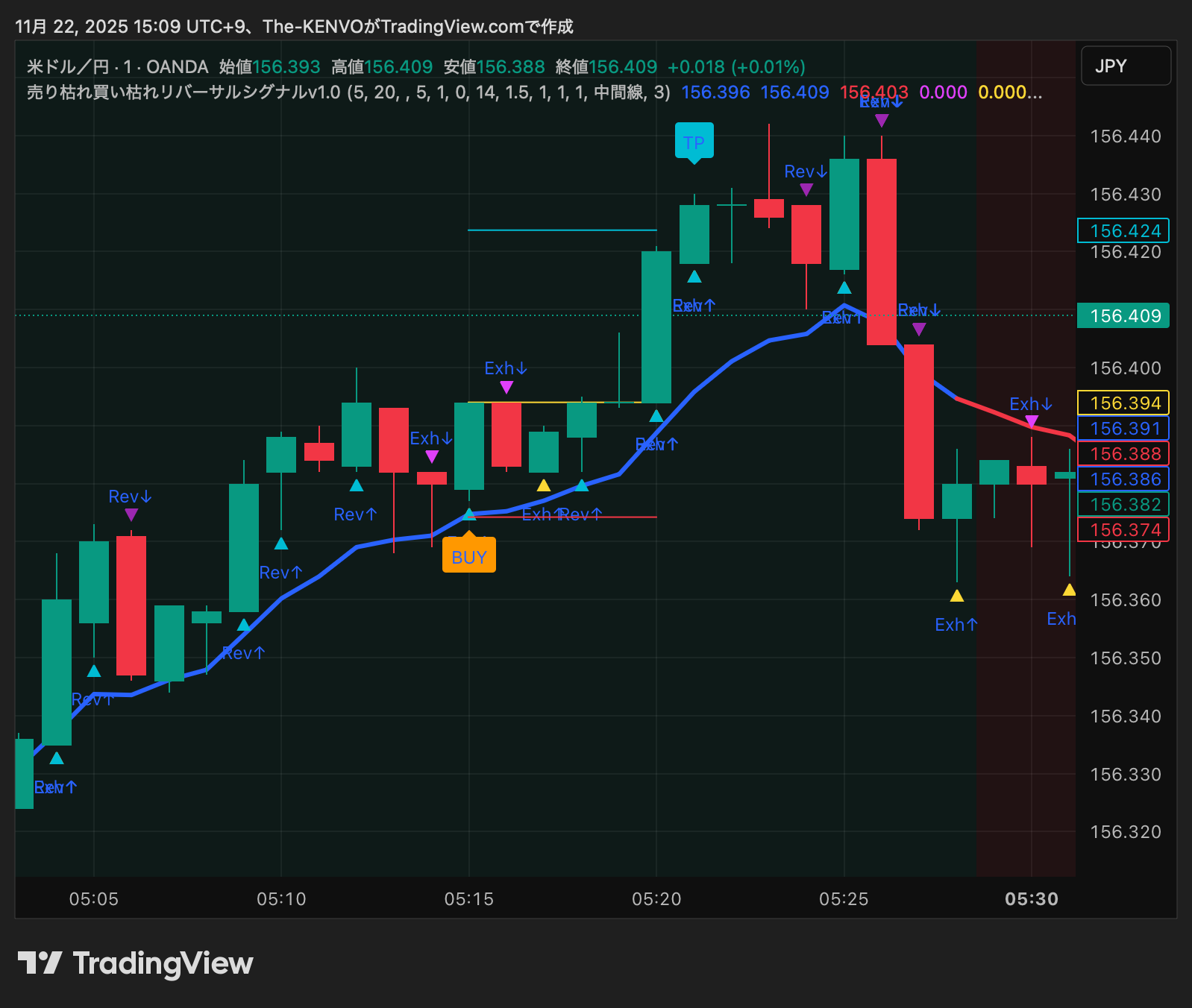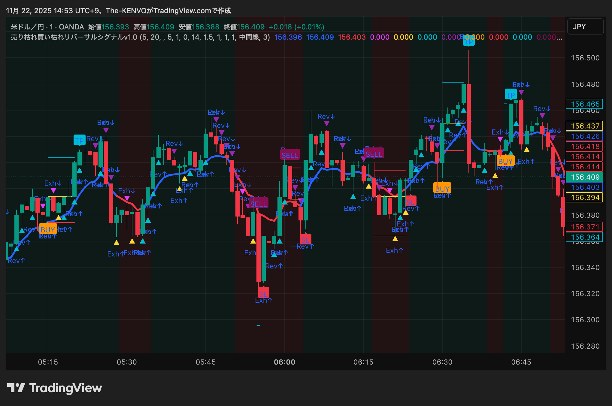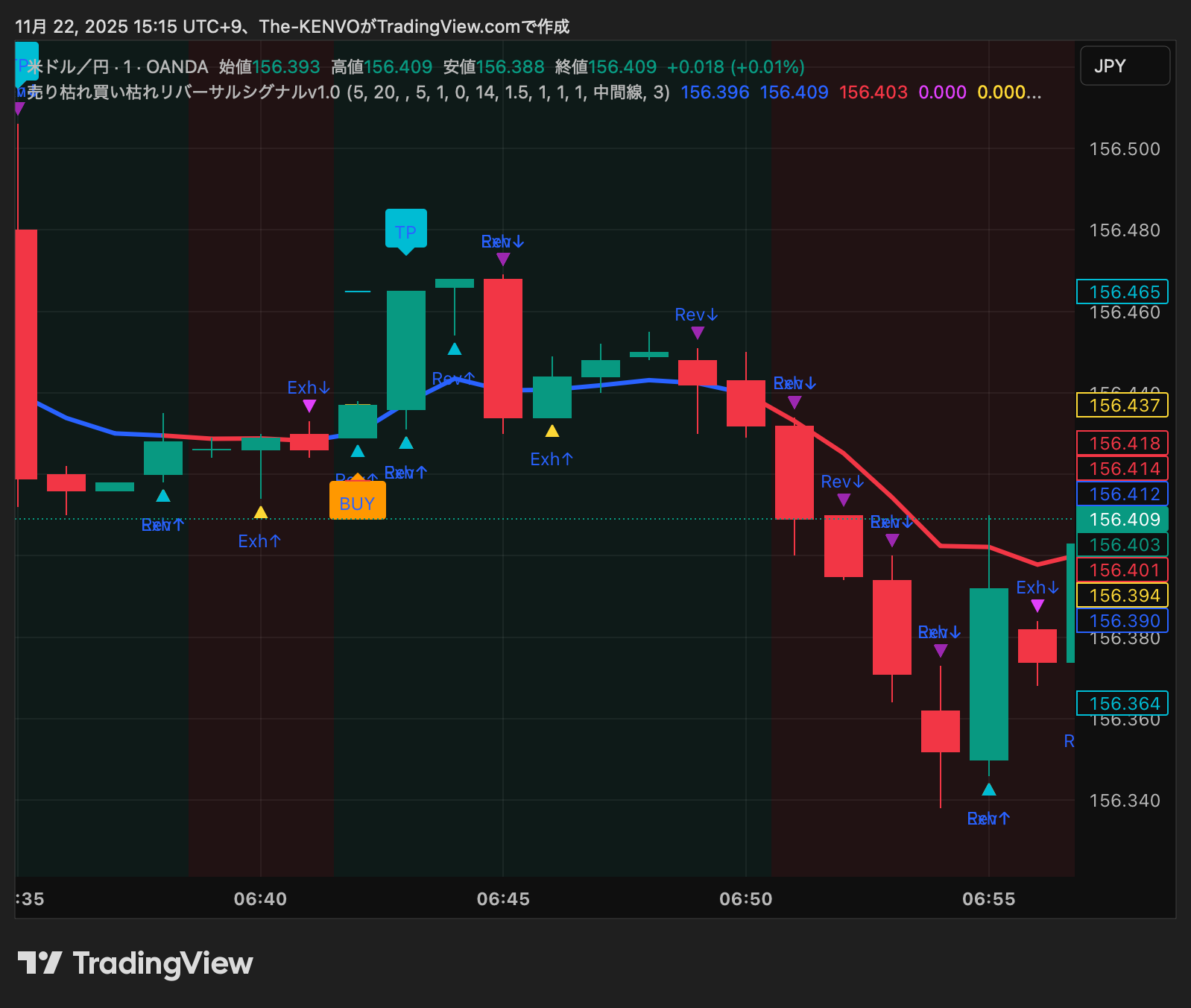 【実戦解説その4】売り枯れ買い枯れリバーサルシグナル v1.0 —2025/11/22 早朝・ドル円1分足のリアル検証