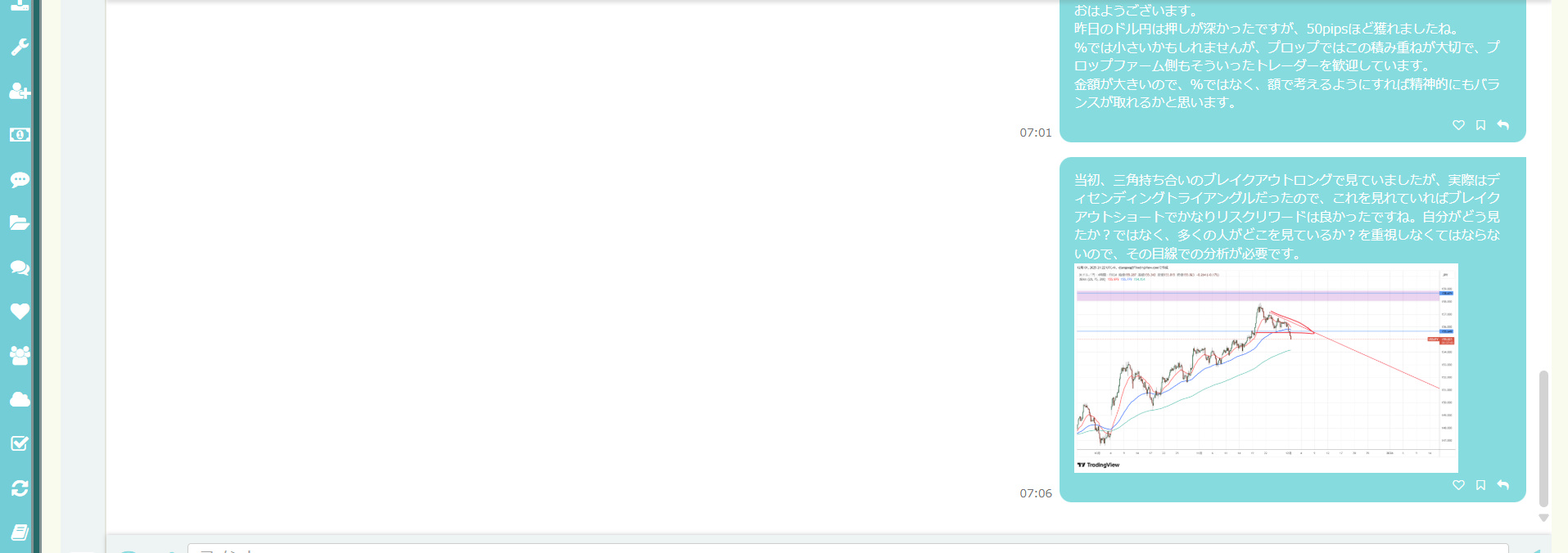 金額が大きいので、%ではなく、額で考えるようにすれば精神的にもバランスが取れるかと思います。コミュニティでは、エントリーと決済の分析を行いますが、指値が可能な場面ではリアルトレードで解説しています。
