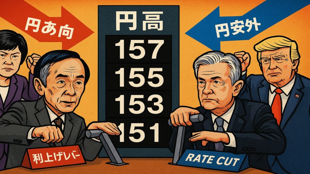 æ¥éã®å©äžãç¹ã蟌ã¿ãé«ãç¶æ ã§èŠéãããå Žåãåå¿ã¯FRB以äžã«æ¥ã§ããéå»ã®äŸã§ã¯ã2025幎10æäŒåã§3å以äžã®åå®åå¿ãèµ·ããŸãããä»åãåæ§ã«ã153åå°â156åå°ãžäžæ°ã«è·³ãäžããã·ããªãªãæ³å®ãããŸããåžå Žã§ã¯ãããã€ã³ãã»ã¶ã»ã«ãŒãïŒæ¥éã®å€æãé ãïŒãæ¹å€ãåçãã幎æ«ã®æµåæ§äœäžãšéãªãã°ã156ã157åå°ãŸã§èŠéã«å ¥ããšãã声ããããŸãã