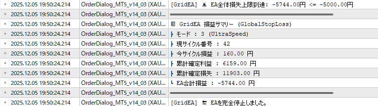 設定画面を見ていただくとわかるように、『EA全体損失上限到達:-5744.00円 <= -5000.00円』という表示が出ていますね。