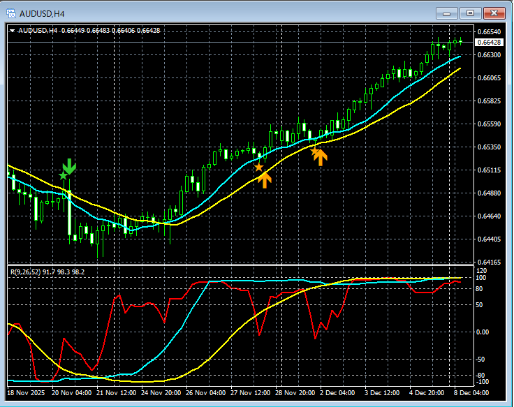 百戦錬磨【RCIを極めて移動平均線フィルターで勝つ!!】AUDUSD 4時間足 mBDSRのサイン