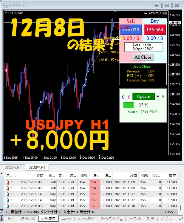 【前日の結果】USDJPY H1 / M5 『ATS-25』12月8日
