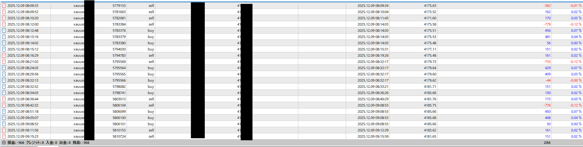 結果としては、EA合計損益が286円となりました。実はこの日、相場の動きがちょっと読みづらくて、一時はマイナスになる場面もあったんです💦