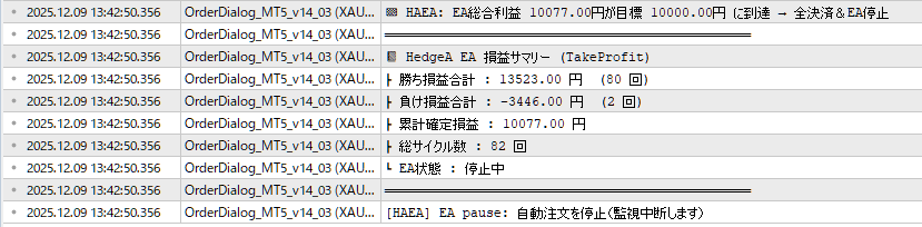 ✅ 口座B(HedgeA EA):10,077円の利益(目標達成で自動停止)