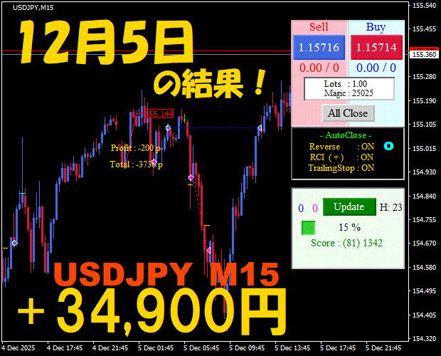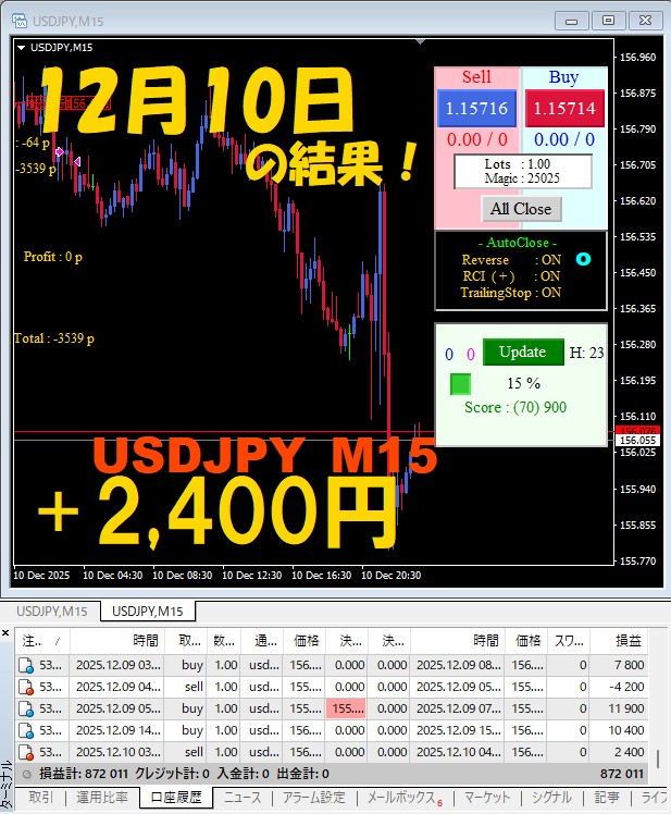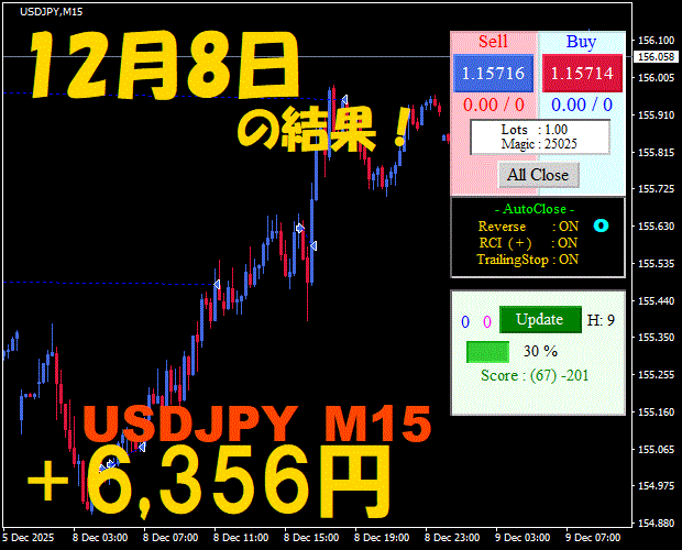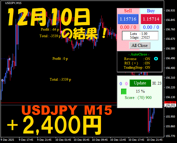 【USDJPY M15】前日の結果『ATS-25』 12月10日