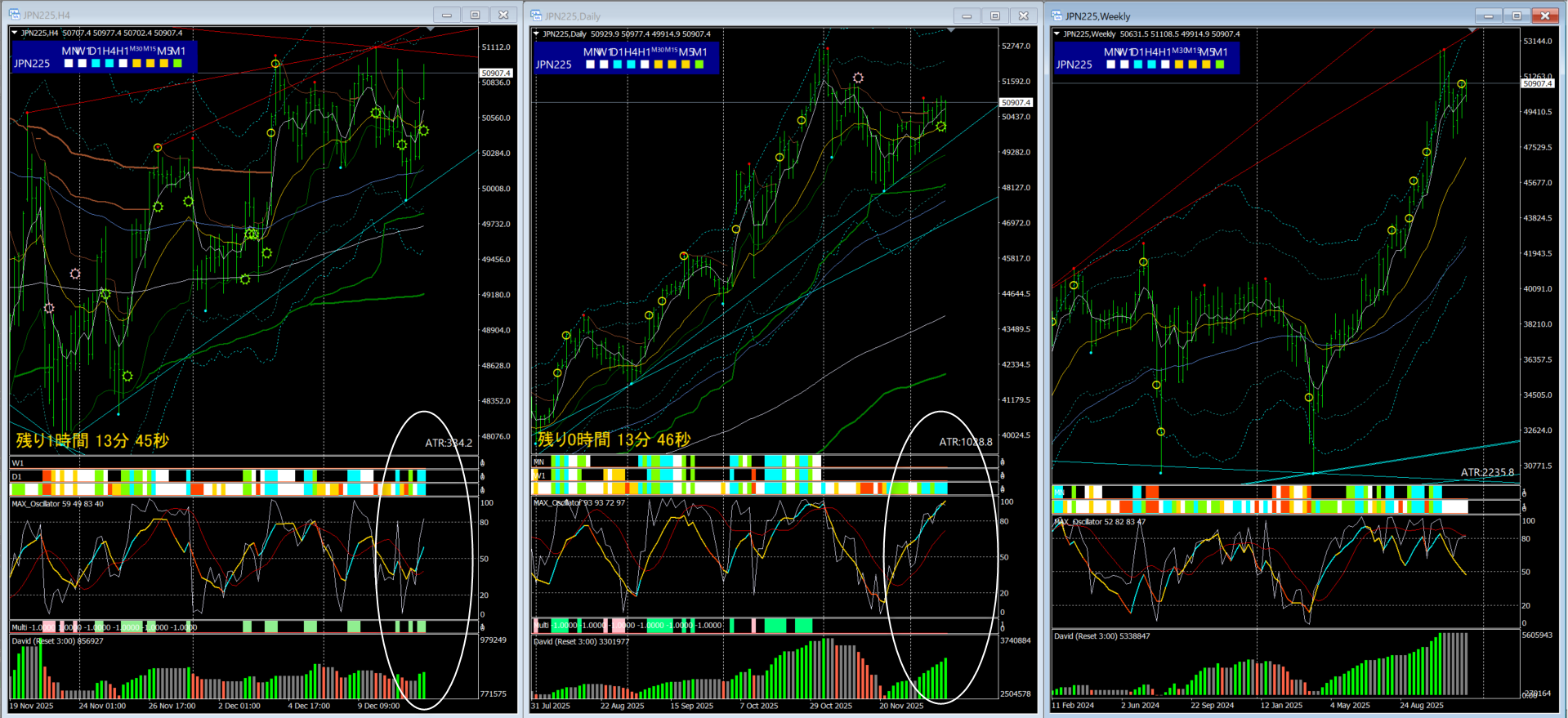 一方で、週足のMAXオシレーター、シンクロバンドは「中立」を示唆