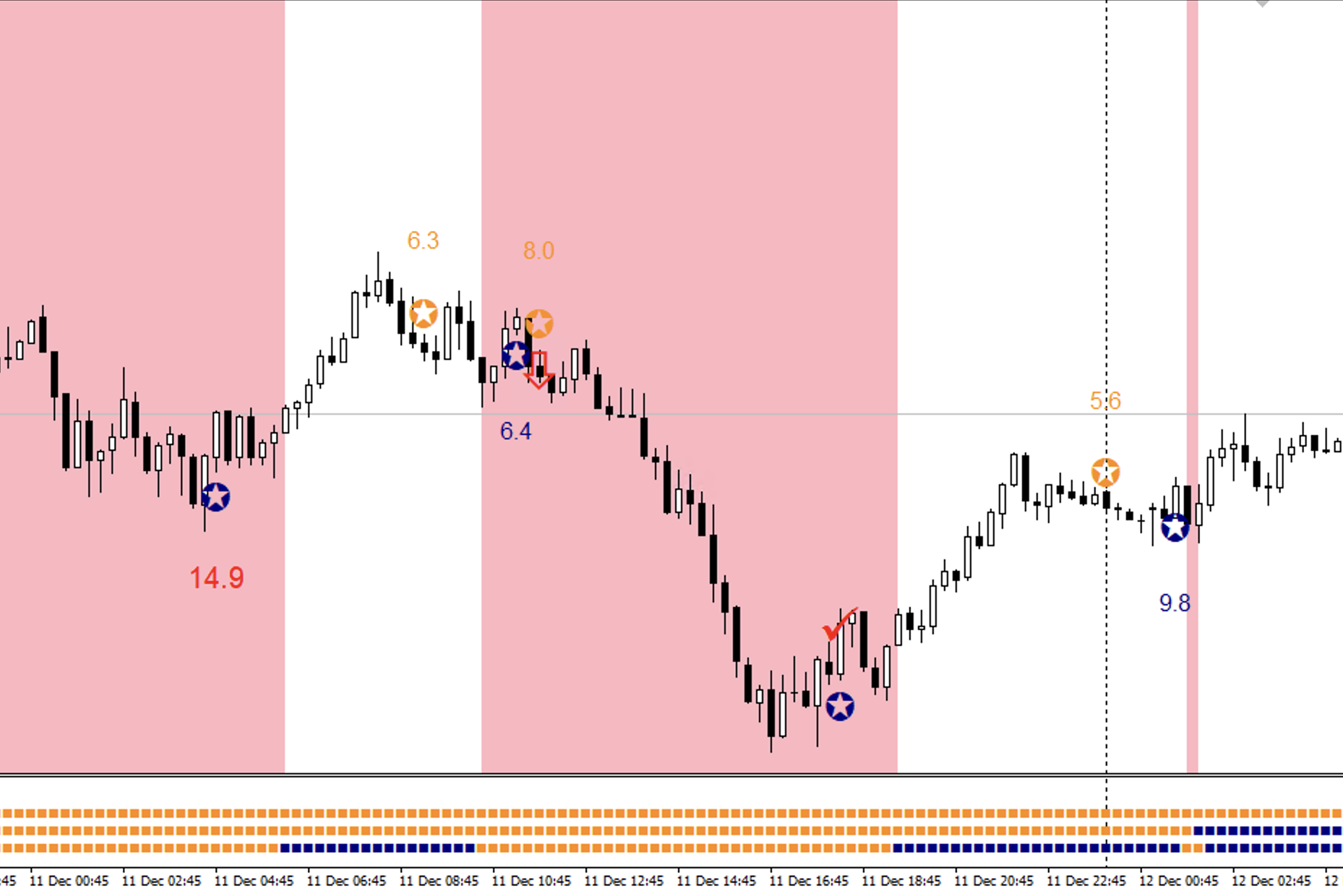 12月11日のドル円は、日足が調整局面に入っている中で、4時間足・1時間足が下降トレンドへと転じていたため、15分足では戻り売りを狙える場面がありました。 本来であれば“買い”を狙いたい相場環境ですが、短期的に1時間足がしっかり下降している局面で、リスクリワード1対1程度を確保できるなら、無理のない良いトレードと言えます。 サイン通りにトレードで、15分足トレードでも57pipsの利益がしっかり取れます。