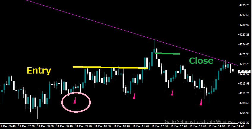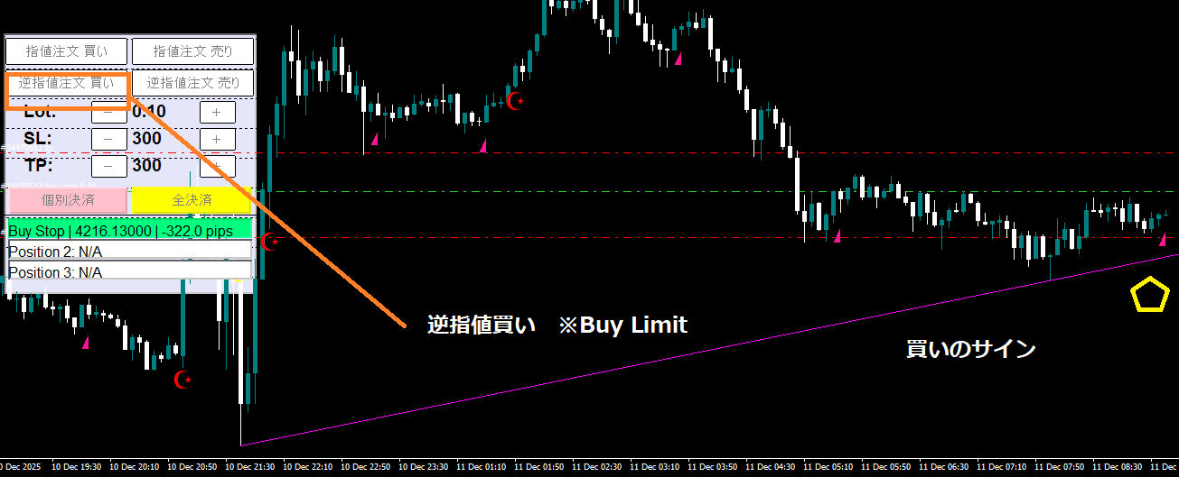 こちらは、買いのサイン確認後、注文パネルから「逆指値買い Buy Stop」を指定。